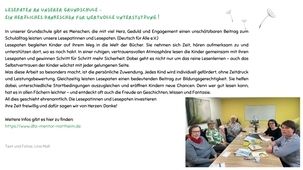 1616 Apr.Apr. 20262026 Lesepaten und Lesepatinnen an unserer SchuleLesepaten und Lesepatinnen an unserer Schule Category: April 2026 Tags: View MoreView More